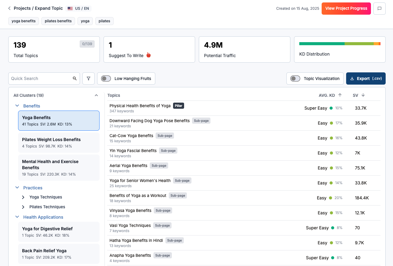 If you prefer a traditional keyword list view without clustering, you can export your keywords as a CSV file. This allows you to filter, sort, and manage your keywords just like before.