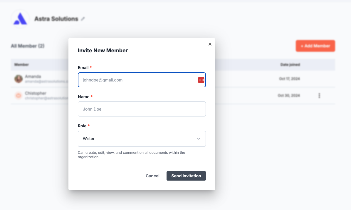 - Manager: Has full control over the organization, including inviting people and updating organization settings. Can also create, edit, and view all documents.