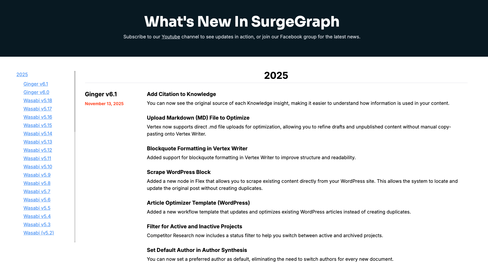 You can stay in the loop on our latest improvements through our SurgeGraph's Facebook Group, email, and the What's New page.